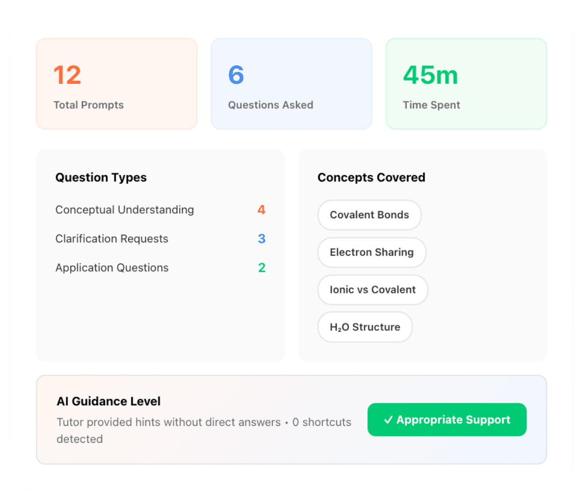 Let students use AI - with guardrails that ensure learning happens. See every interaction, every struggle point, and exactly how they solved problems. No more "did they cheat?" anxiety.