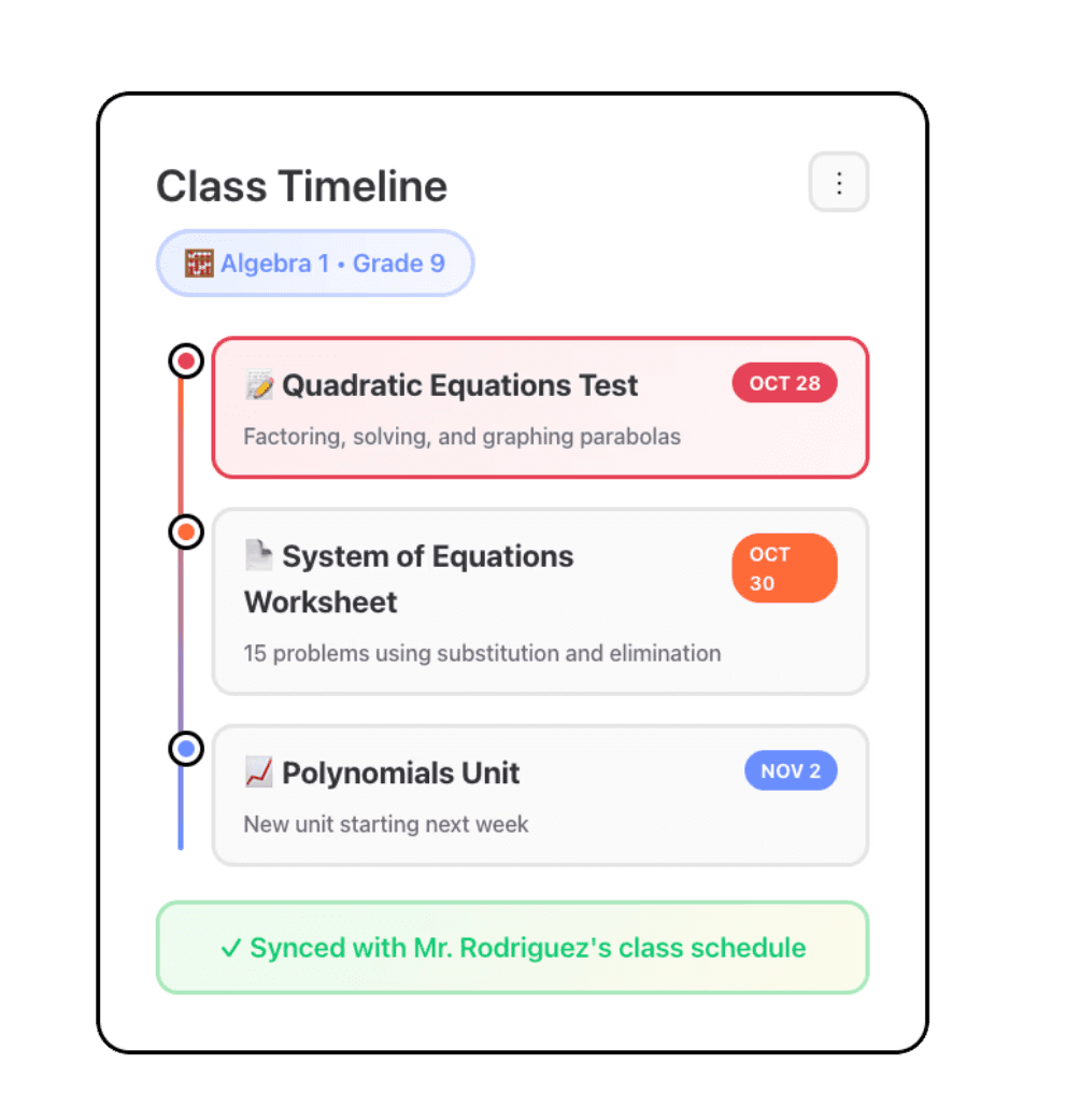 Tutors sync with your class calendar - they know upcoming tests, assignment due dates, and what topics to prioritize. They reference class documents and materials so students study what actually matters.