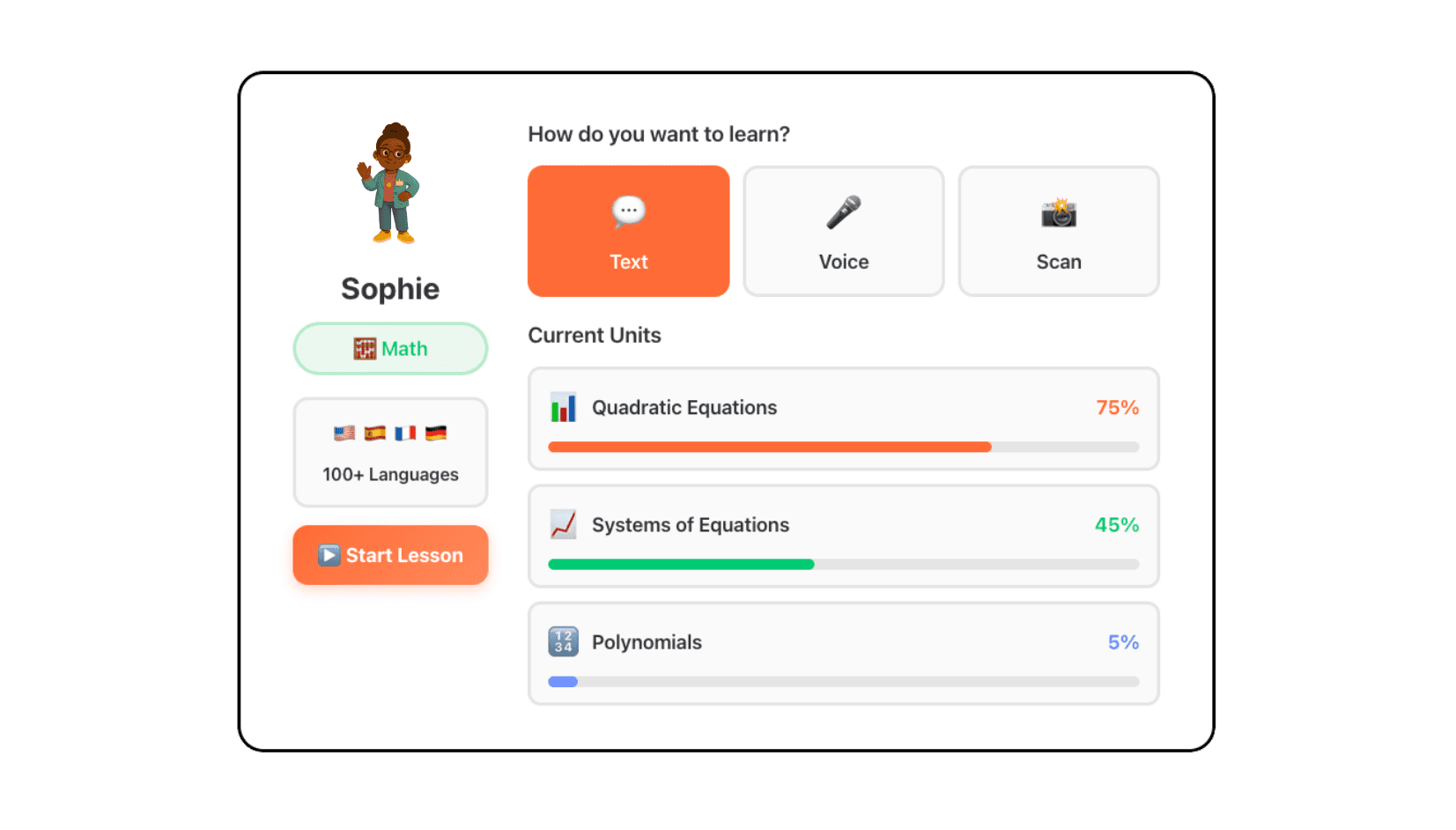 Students can interact with tutors through text, voice, or by scanning handwritten work. Whether typing questions, talking through problems, or uploading a photo of their homework - tutors adapt to however students prefer to learn.